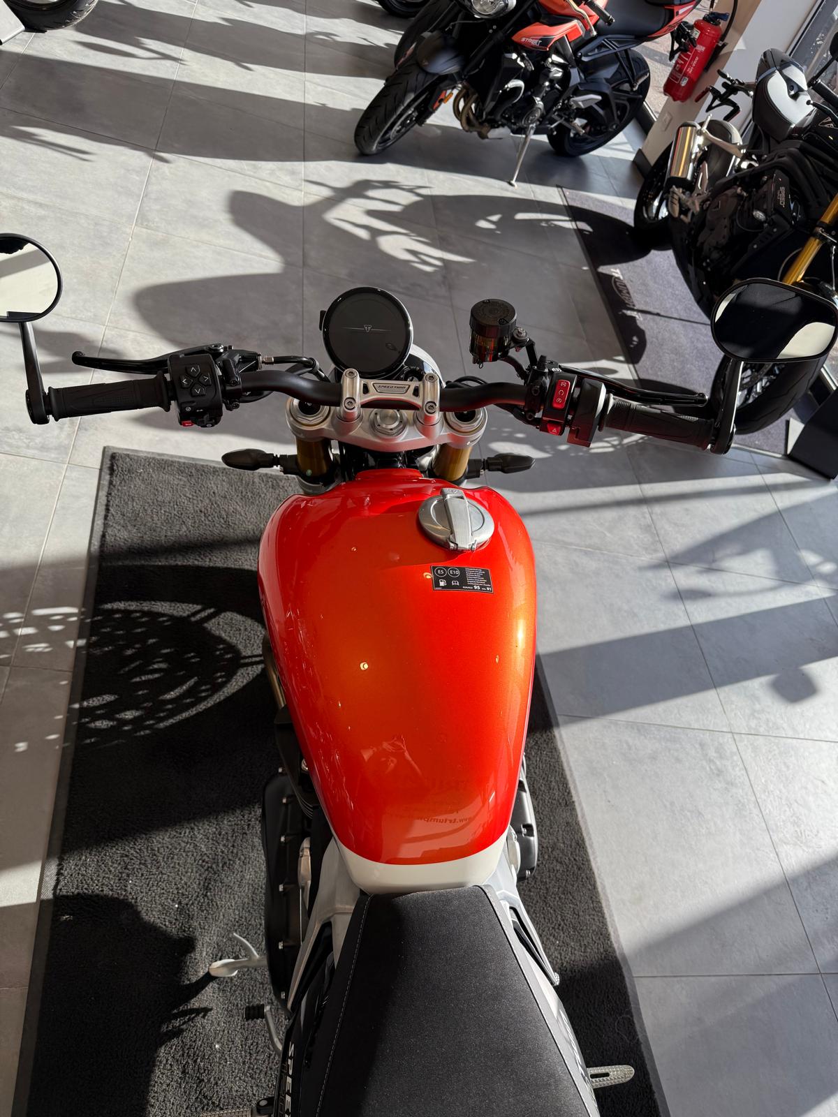 Superbe Triumph Speed Twin 1200 RS dans sa magnifique teinte Matt Baja Orange, modèle 2025, 1ère main et disponible à l’essai chez Triumph Livry-Gargan.